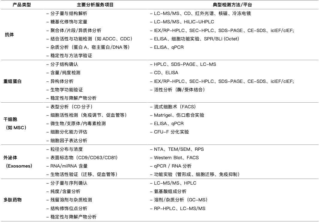 分析检测中心提供全面的各类型生物药(抗体、重组蛋白、多肽、干细胞、外泌体等)分析及质量研究服务,包括但不限于以下项目