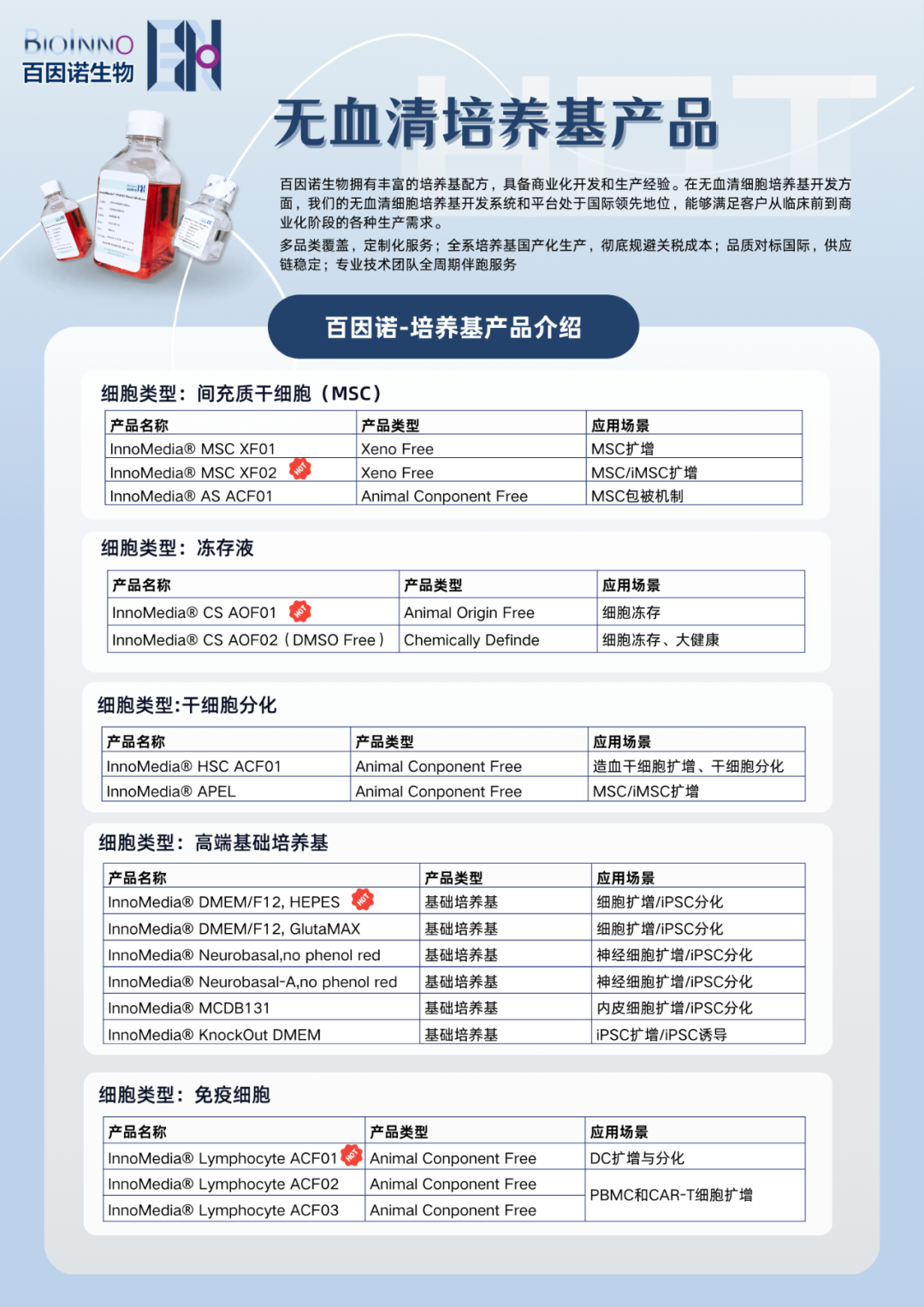 新学期伊始,实验室的“战斗”即将打响,而优质的培养基,正是你科研路上的关键“装备”!百因诺无血清培养基,以严苛标准打造,剔除血清干扰,让细胞培养更稳定、实验结果更可靠,助力每一位科研人精准突破实验难题。